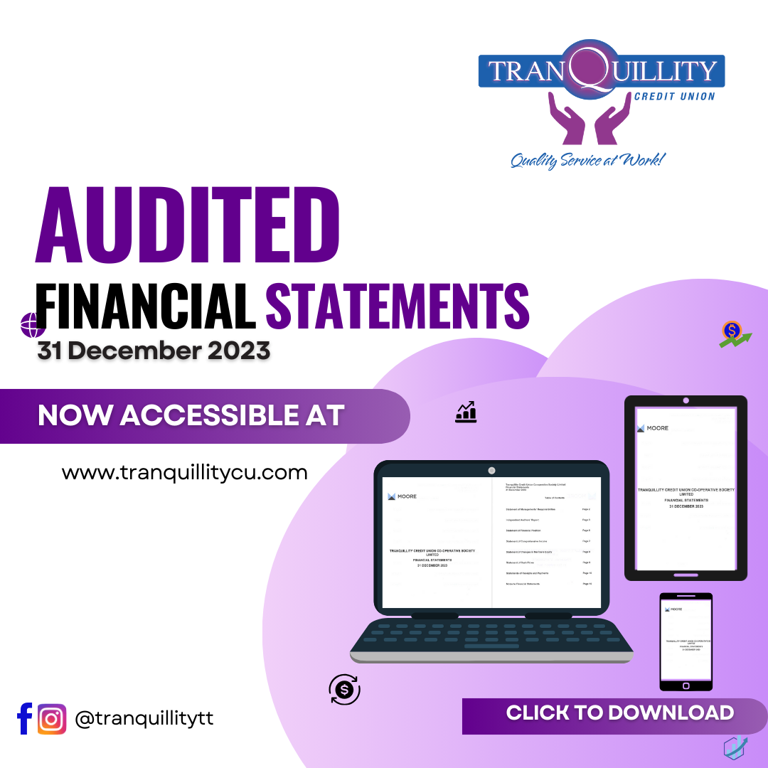 Tranquillity Credit Union is pleased to present to you our Audited Financial Statements for the year ending 31st December 2023. Thank you.